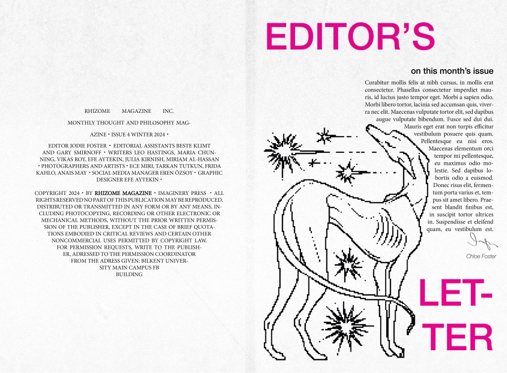 The Rhizome is a bi-yearly philosophy magazine where the conventional thought is challenged in each issue. With minimal yet striking design elements, its content is waiting to be written.